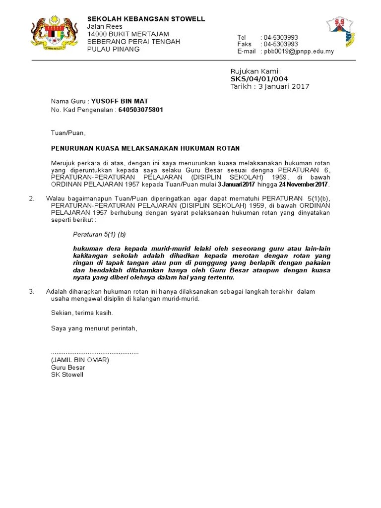 Contoh surat kuasa merotan download kumpulan gambar. Lampiran 11 contoh surat penurunan . Merujuk perkara di atas, dengan ini saya menurunkan kuasa melaksanakan hukuman rotan yang diperuntukkan kepada saya . Spi bil.07/2003 pekeliling kuasa guru merotan murid. Ekoran kisah cikgu azizan ini had hukuman guru pada murid mengikut undang undang anda perlu tahu. Contoh surat penurunan kuasa merotan.